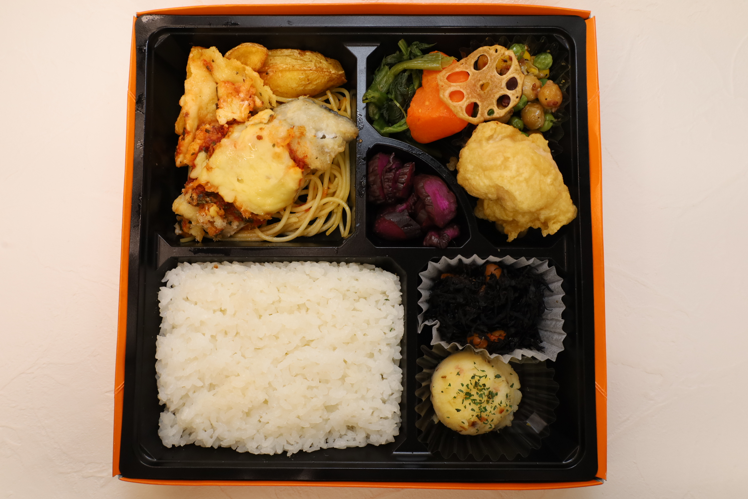白身魚のプロバンス風豪華弁当 1,080円(税込) 白身魚をさっぱりプロバンス風に仕上げた変わり種メニュー。副菜はボリュームたっぷり、お野菜たっぷりでガッツリ派の方もバランスよく食べていただけます。満足の一品! 弁当内容 白身魚のパン粉焼き/スパゲティー/とり天/ポテトサラダ/ひじきの煮物/ポテトフライ/ほうれん草のコンソメ煮/ビーンズサラダ バジル風味/にんじんのグラッセ/お新香/白ご飯 ●付属品:割箸/おしぼり/楊枝●箱のサイズ:22.5cm×22.5cm×4cm 数量: - + お気に入りに追加 前のページに戻る