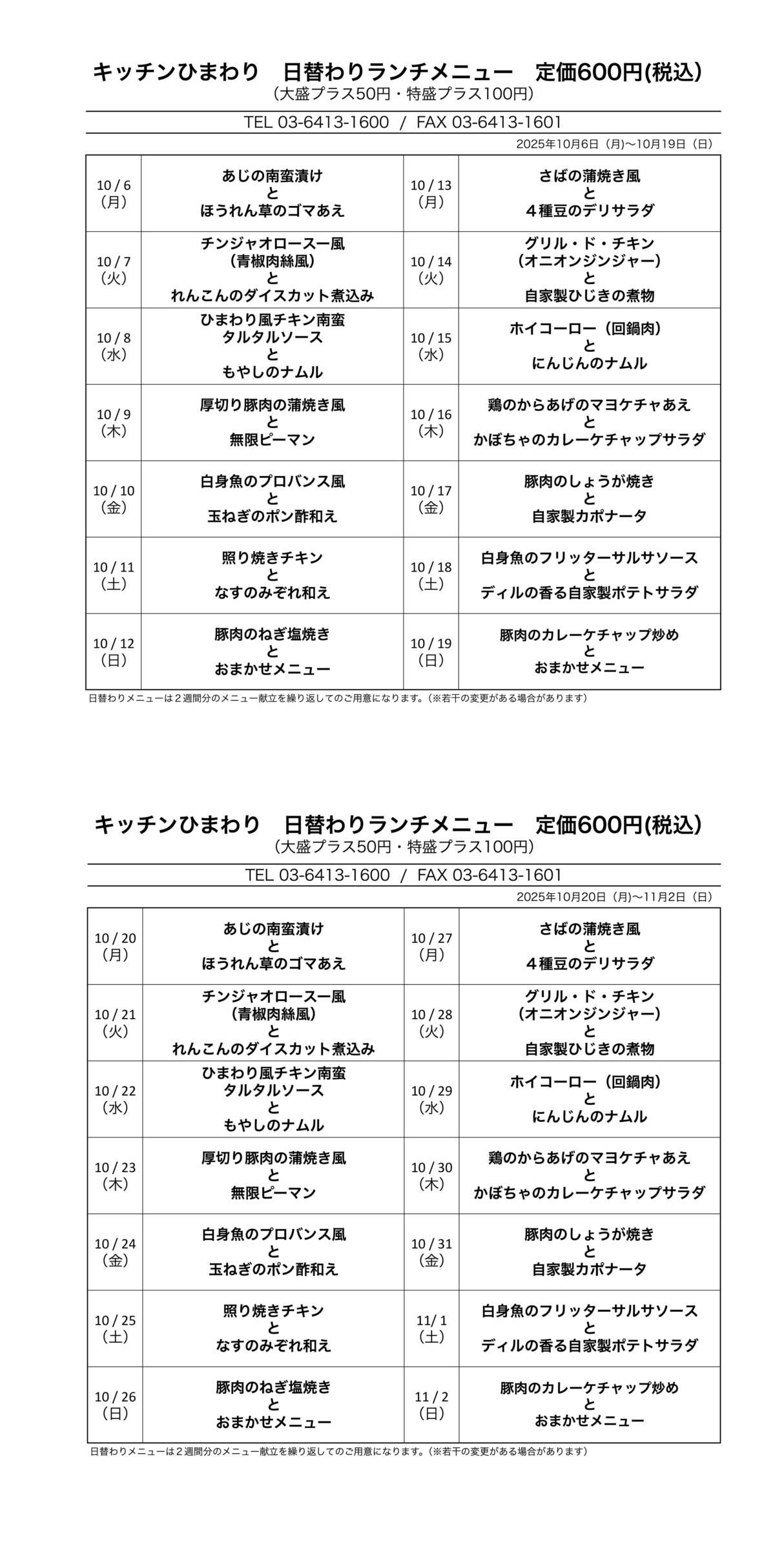 日替わりはご飯の大盛り+50円・特盛+100円です。