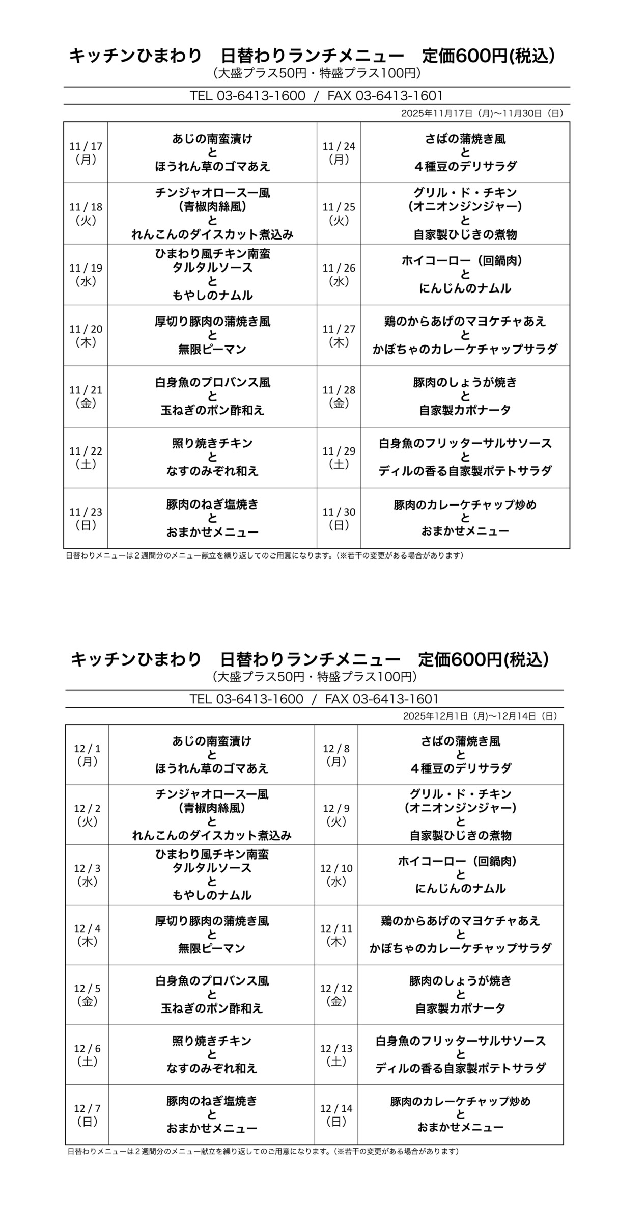 日替わりはご飯の大盛り+50円・特盛+100円です。当日注文は11時までにお電話ください!テイクアウトもできます。社食ランチに、定期でのご利用も大歓迎です。メール・お電話にてご相談ください。※日替わりメニューはポイント付与対象外となります。 日替わり弁当 ご注文はこちらから